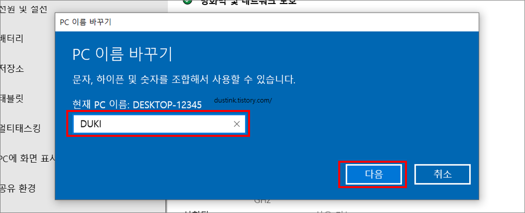 4) 변경할 이름을 기입하고 다음을 누른다.