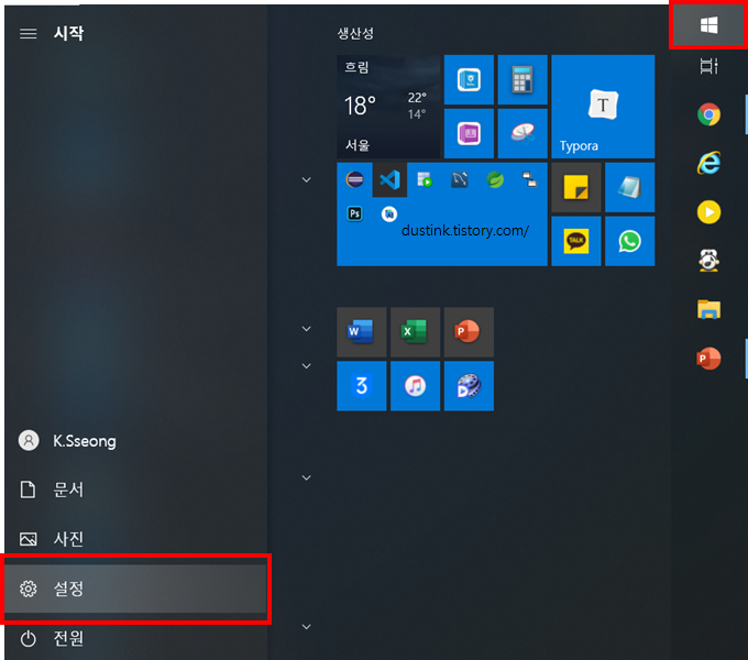 1) 시작 버튼을 누르고, 설정을 누른다. (window + i 키를 눌러도 설정 화면이 뜬다)