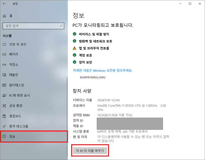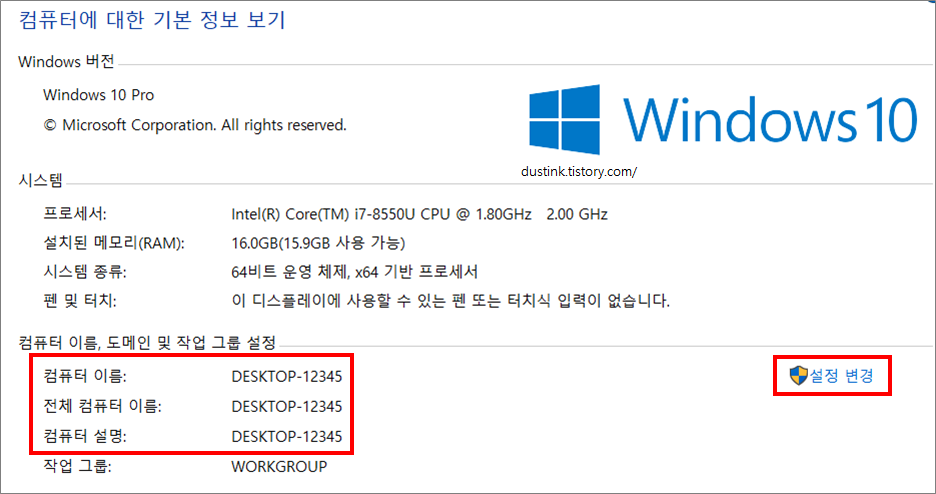 현재 PC의 이름은 DESKTOP-12345이다. 이제 이걸 변경해보도록하자.