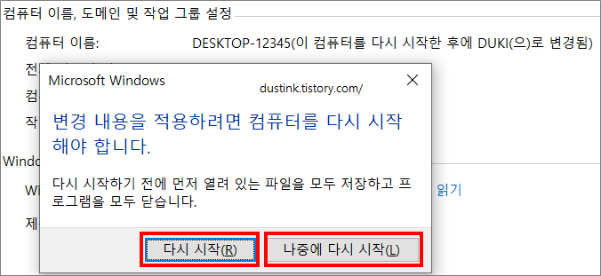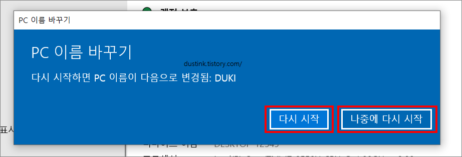 5) 다시 시작(바로 재부팅) 또는 나중에 다시 시작(나중에 재부팅)을 선택 한다.