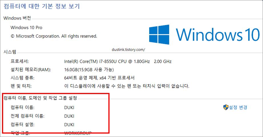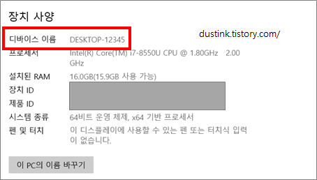 그래서 윈도우10 에서 무작위로 생성되는 컴퓨터 이름을 그대로 쓰면 PC 이름이 헷갈릴 수 있어 바꿔줄 필요가 있다.