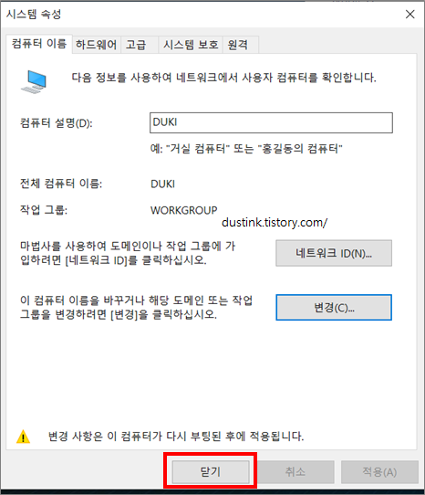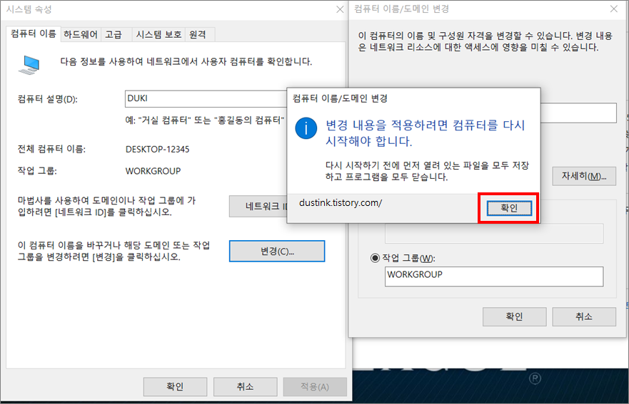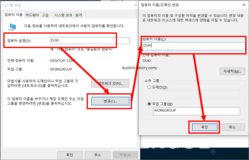 3) 컴퓨터 설명에 변경할 이름 기입하고, 변경 선택 후 컴퓨터 이름에도 변경할 이름 기입하고 확인을 누른다.