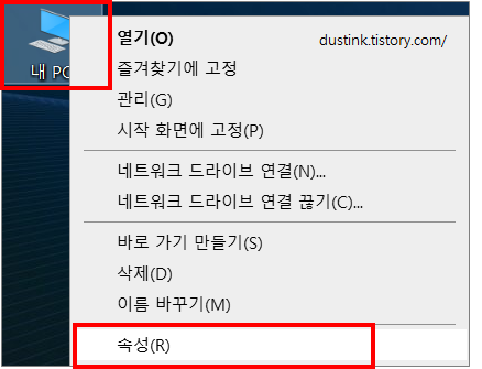 1) 내 PC(내컴퓨터) 우클릭 후 속성을 선택한다.