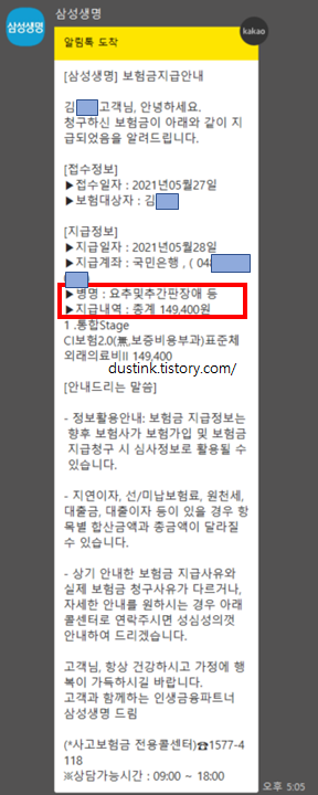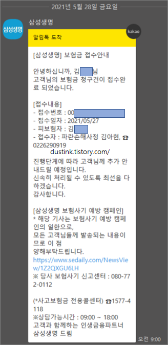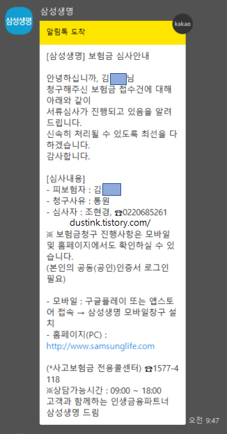 보험금 심사안내 라고 하며, 카톡이 하나더 도착한다.