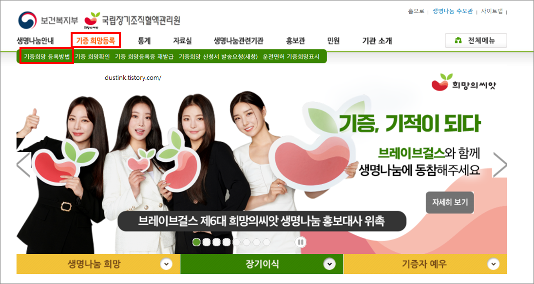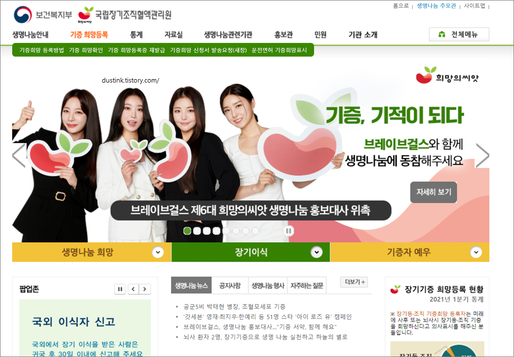 사이트는 별도운영인데, 관리는 보건복지부에서 같이 하는듯하다. 신청은 국립장기조지결액관리원에서 했다.