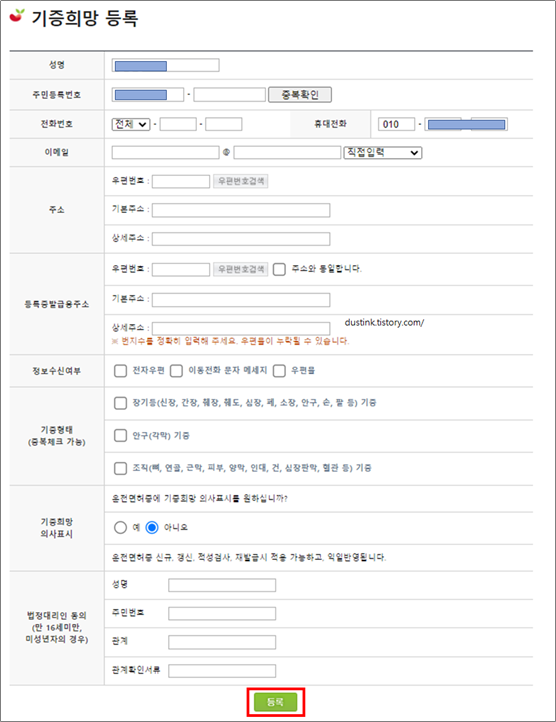5. 기증희망 등록, 개인정보를 다 채운후 하단에 등록을 누른다.