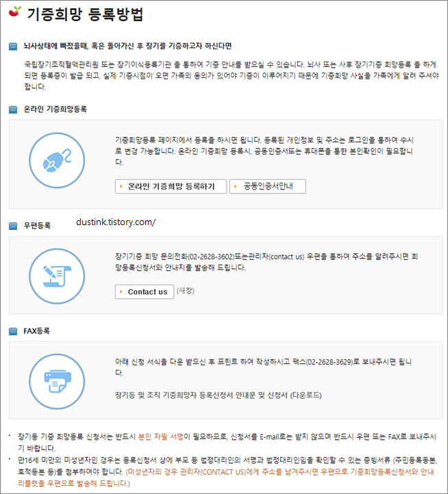 장기기증희망 등록은 국립장기조직혈액관리원 또는 사랑의장기기증운동본부에서 가능하다.
