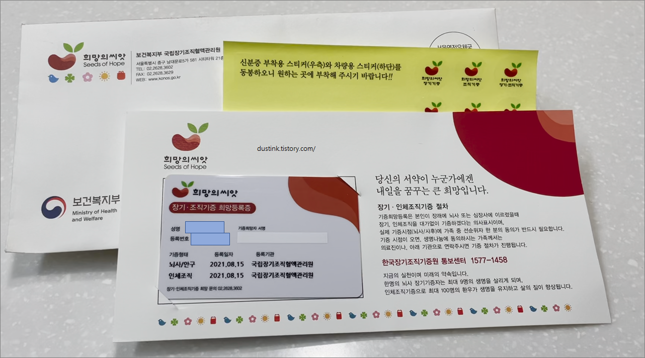 신분증과 차량에 부착할 수 있는 기증스티커가 있다.