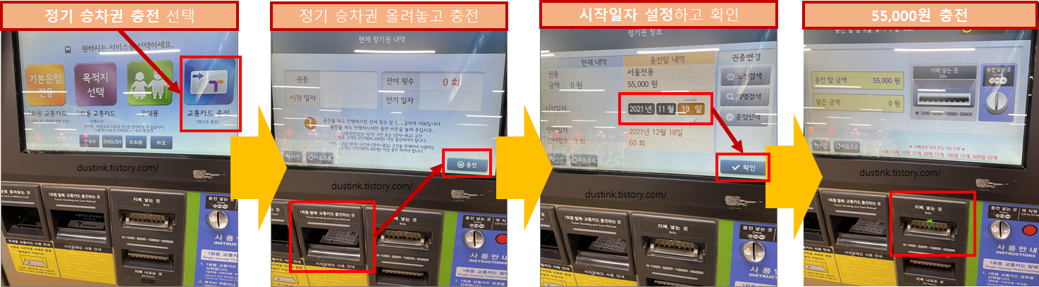 다만 정기권을 개시하는 시작일자를 설정하고, 55,000원을 충전하면 된다.