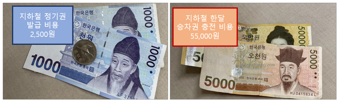 정기 승차권 발금 전 준비물 :) - 지하철 정기권 발급 비용 - 현금 2,500원 - 지하철 한달 정액 충전 비용 - 55,000원 CASH ONLY (현금만 된다.. 카드 안되요..😅)