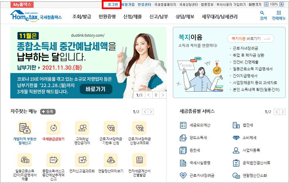 1. 국세청 사이트에 접속, 로그인 (아래 사진 누르면 국세청 사이트로 이동한다.)