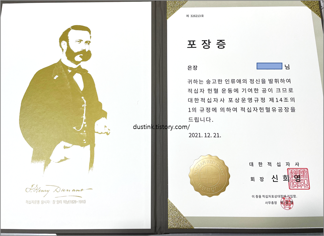 적십자헌혈유공장을 준다는 감사의 문구와 대한적십자사 날인이 같이 있다.