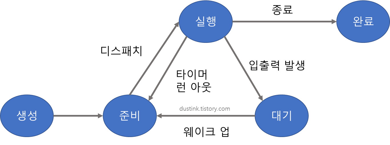 - 완료(Complete) 상태: 프로세스가 CPU를 할당받아 주어진 시간 내에 완전히 수행을 종료한 상태