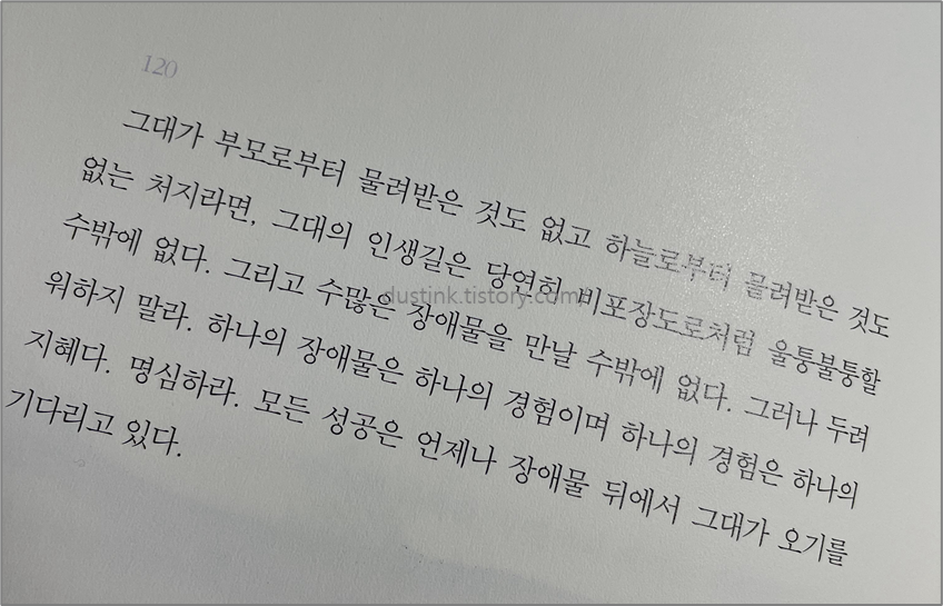 이 책에는 많은 주제가 있었는데, 요즘 상황에 맞는 글들만 눈에 들어와서 그런지, 이런 글들만 눈에 들어오게되었다. 쉽지 않은 현실에서 아등바등하면서 살다보니 힘을 주는 글귀는 삶의 원동력 같은 느낌이다. 글들을 통해 '한번 더' 라고 생각하고 모든 것을 시도하고 있으니.