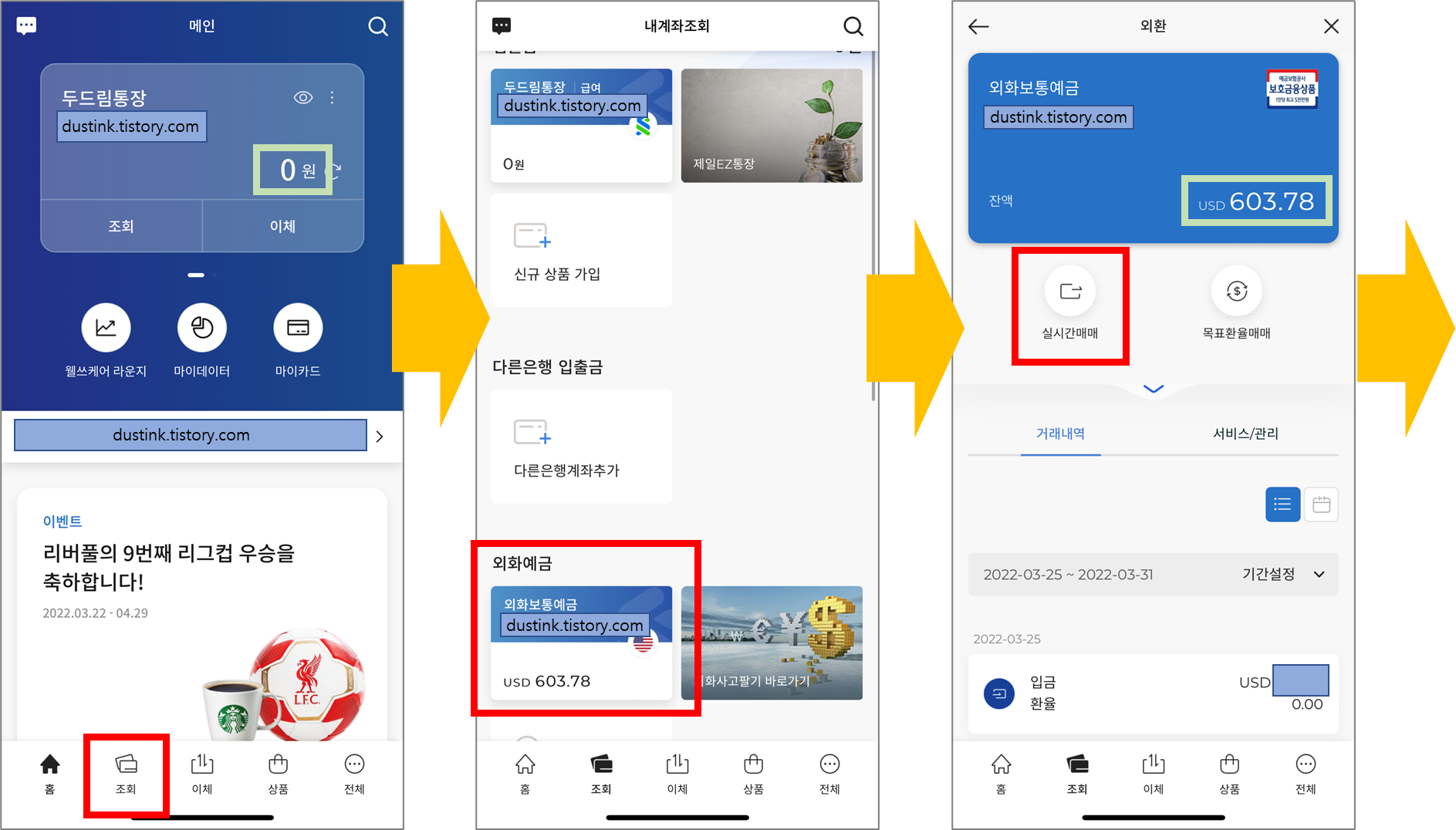 SC 앱을 실행 후 조회 선택 -> 외화 보통예금 선택 -> 실시간 매매 선택 ->