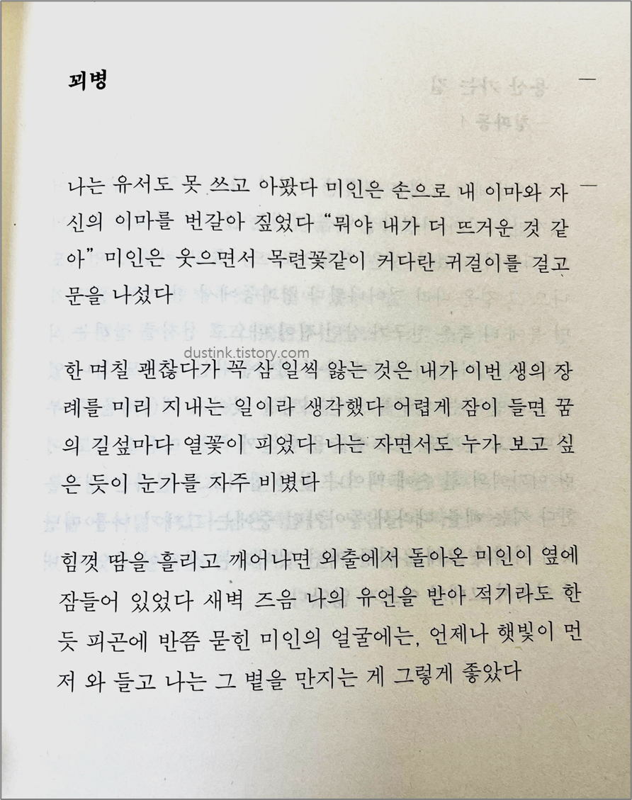 나도 당신처럼 한번 아름다워보자고 시작한 일이 이렇게나 멀리 흘렀다. 내가 살아있어서 만날 수 없는 당신이 저 세상에 살고 있다. 물론 이세상에도 두엇쯤 당신이 있다. 만나면 몇 번이고 미안하다고 말하고 싶다.