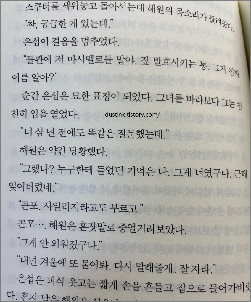 배경이 겨울인 책인데 읽는 동안 따뜻한 봄을 느낄만큼 가슴 따뜻한 문장과 문구들이 많았다. 읽는 동안 주위가 배경이 상상이 되고, 해원과 은섭의 행동이 선명하게 상상되는 느낌이 들어 묘사를 참 잘한다는 느낌이 들었다. 격정적 사랑을 다루는 소설도 좋지만, 이렇게 은은한 사랑이야기의 소설도 너무 좋다.