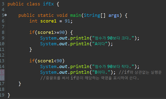 if문은 조건식이 true이면 블록을 실행하고, false이면 블록을 실행하지 않는다.