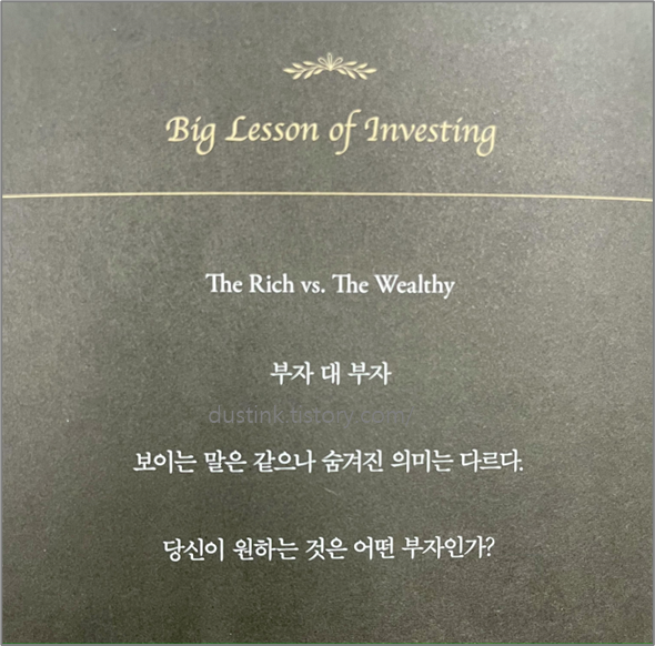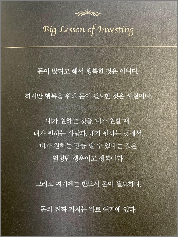 그리고 또 다른 장점은 각 챕터 마지막에 주제에 대한 요약을 한 번더 언급한다. 모든 챕터 마지막에 있는 'Big Lesson of Investing' 다시금 이야기를 상기시킬 수 있도록 각 챕터의 이야기들을 요약해준다.