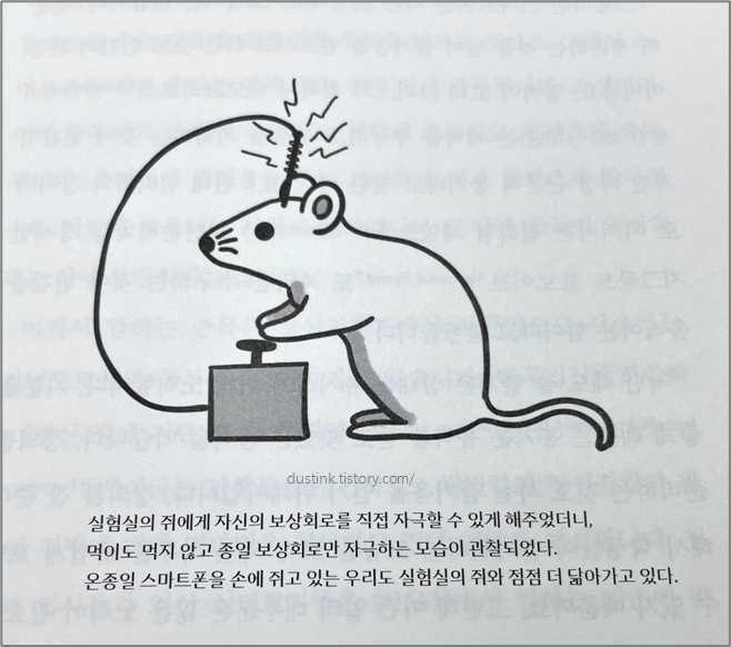 자기 뇌의 보상회로를 자극하는 전기 스위치를 누르느라 먹지도 않는다는 실험용 쥐의 모습은 어쩌면 온종일 스마트폰에 빠져 있는 현대인의 자화상이다. 디지털 기술과 기기들은 많은 편리를 가져다주지만, 스마트폰이 낳은 신인류 포노 사피엔스는 이제 스마트폰에 중독되는 인간, 호모 아딕투스(Homo addictus)로 변해가고 있다.