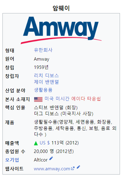 Amway(암웨이)라는 기업에 대해 들은적이 있을까? 생각해보니, 어릴적 어머니가 일종의 다단계 사업처럼 물건들을 판매하시는 것을 종종 본 것 같다. 어릴적 어머니가 동네 아주머니들과 함께 화장품과 생활 용품을 판매하시기도하고 나눠서 사용하시기도 하는 모습들을 본적이 있었던 것 같다. 너무 오래전 일이라 모토로라라처럼 한국을 철수 했을 것 같기도 하고, '이제는 한국에 없지 않나..?' 라는 생각을 했는데, 여전히 한국에서 사업을 진행을 하고 있었다.