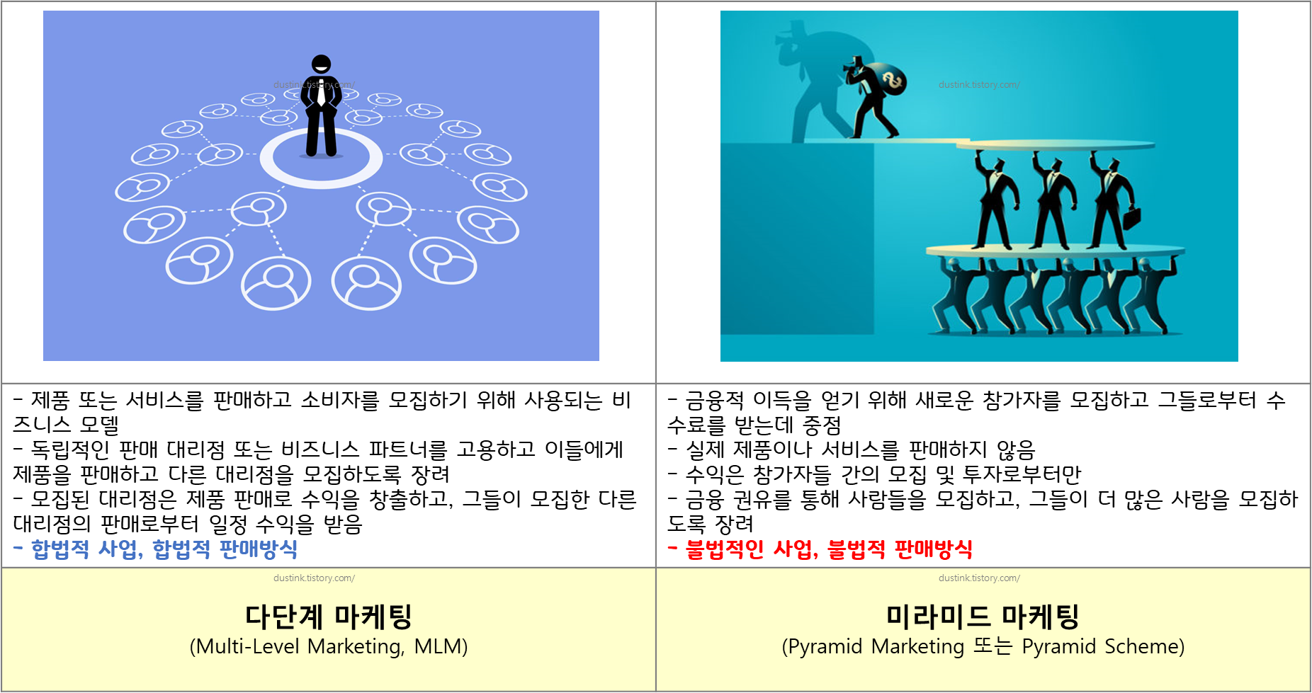 다단계, 피라미드 등 이런 용어를 들어본적이 있을 것이다. 그러나 어떤 것이 나쁜지는 정확히 몰라서 헷갈렸는데, 다단계 마케팅은 합법적인 사업이며, 우리가 안좋다라는 인식이 있던 사업은 미라미드 마케팅이였다.