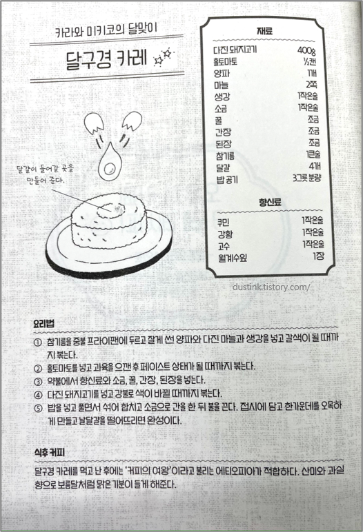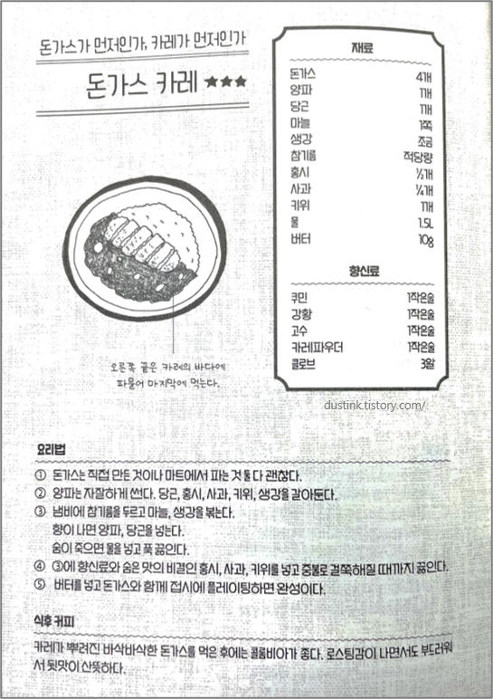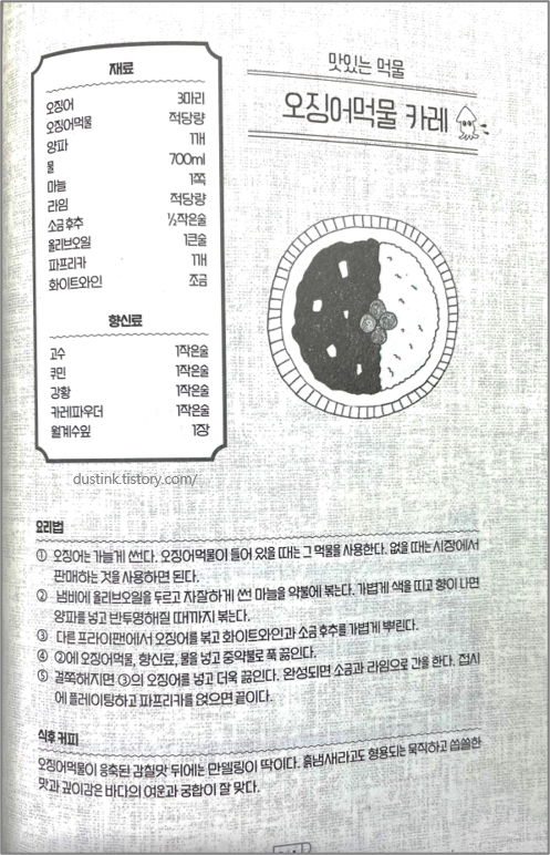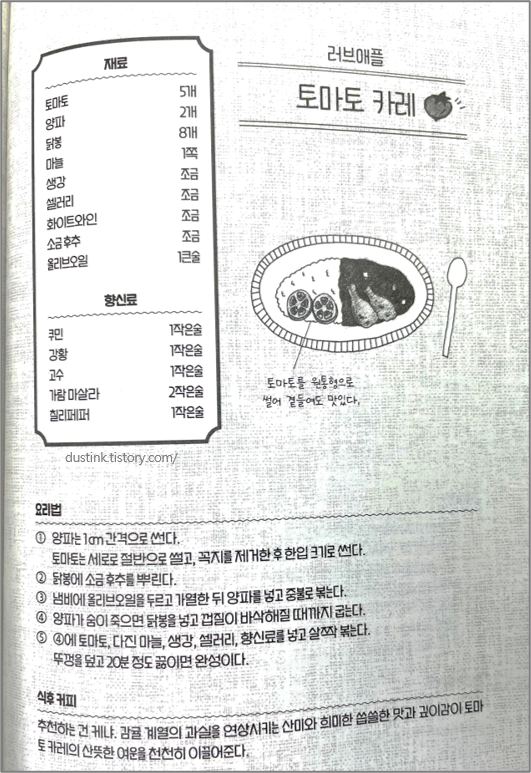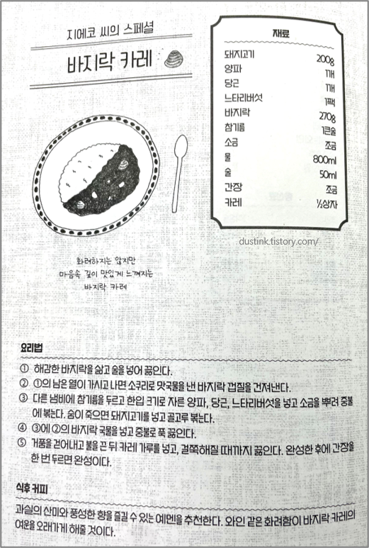그리고 매주 토요일 다들 모여서 먹는 카레는 다양한 식재료로 매번 색다르게 카레를 만들어서 같이 도란도란 식사를 한다. 내가 일반적으로 접해본 카레의 종류는 그렇게 많지가 않았다. 그런데 책에서 소개하는 카레는 종류도 다양하고, 식재료도 다양하게 써서 그 맛이 정말 궁금해게 만들었다. 먹물 카레는 과연 무슨 맛일까..?