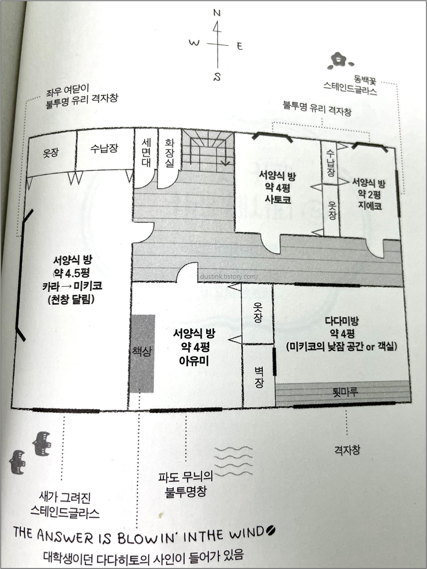 오우치 카페 겸 쉐어 하우스를 배경으로 이야기가 전개 되어 방의 모습이나 카페의 모습, 집의 모습에 대한 묘사가 정말 잘 그려져 있다. 삽화도 있어서 대략적인 느낌은 이해가 되겠지만, 뭔가 더 오래된 느낌의 건축물 느낌이 드는 것 같았다. 아둥바둥 열심히 사는 것 보다 여유를 갖고 지금을 즐기는 삶이 부럽기도 했다. 책에 등장하는 인물들이 주로 40대 이상으로 소개가 되어, 각박한 도시 삶보다는 지방에 내려와서 한적하게 지내는 모습이 좋아보였다. '가마쿠라'라는 지역의 위치는 정확히는 모르겠지만, 도시에서는 확실히 먼 동네일 것 같긴하다.