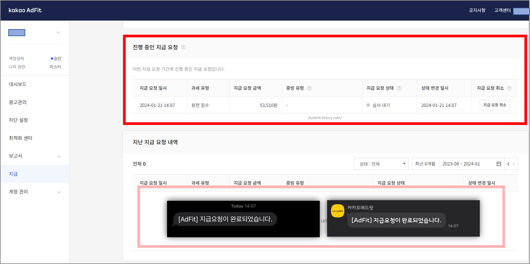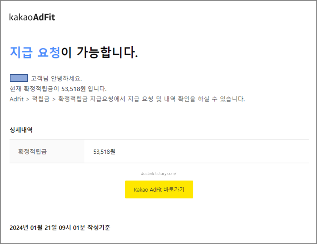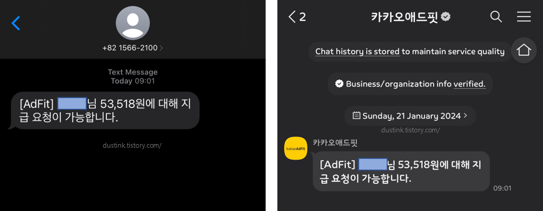 1. kakao AdFit 지급 요청이 가능한 경우 문자 또는 카톡으로 알림이 온다