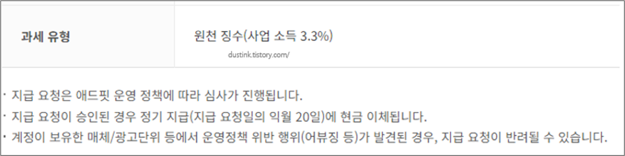 구글 애드센스는 수수료 명목으로 빠지지만, 카카오 애드핏은 수수료 이외에도 세금이 부과가 된다. 과세의 유형에 따라 세금이 변경이 되니 개인사업자 또는 법인이라면 등록해서 이용하자.