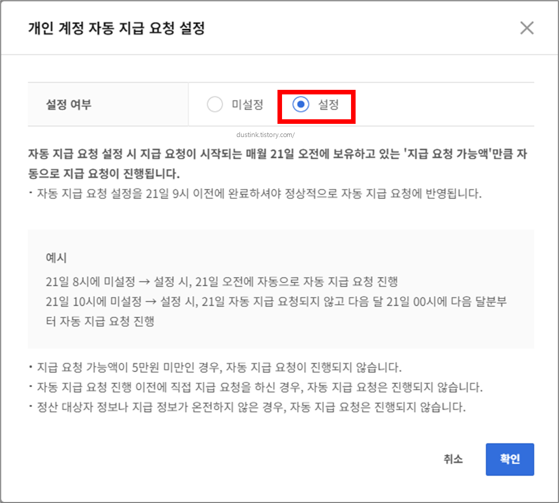 2. 개인 계정 자동 지급 요청 설정에서 설정으로 변경