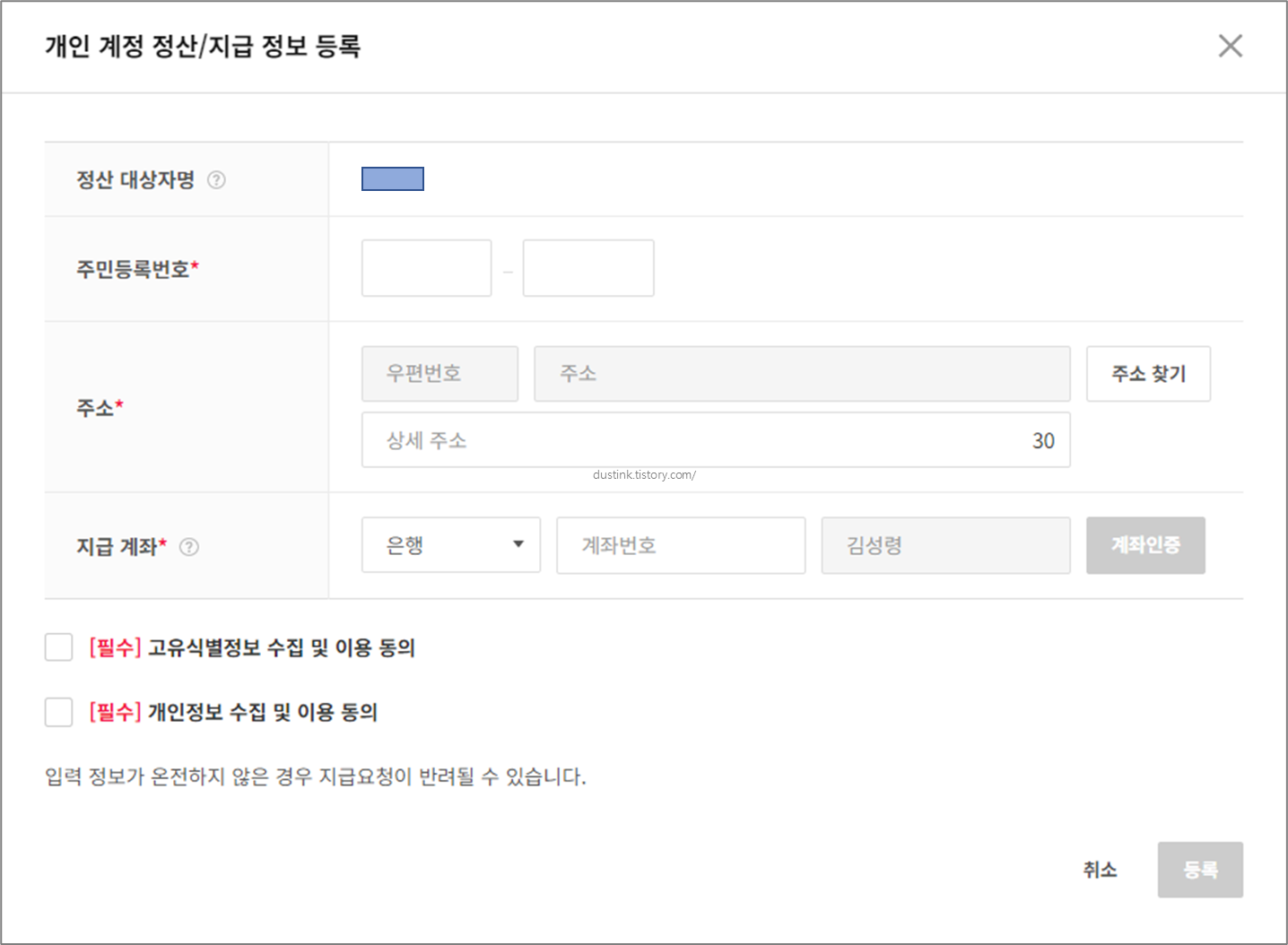 4. 개인 정보와 수익금 받을 계좌를 입력한다