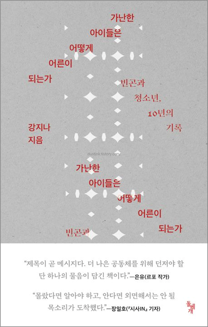 이 책은 가난을 둘러싼 겹겹의 현실에 대한 철저한 해부이자 날카로운 정책 제안인 동시에, 가난이라는 굴레 속에서 이들이 어떻게 삶에 대한 통찰과 지혜를 발견해내는지에 대한 가슴 시린 성장담이다. 은유 작가와 장일호 기자가 사려 깊은 추천글을 보탰다.