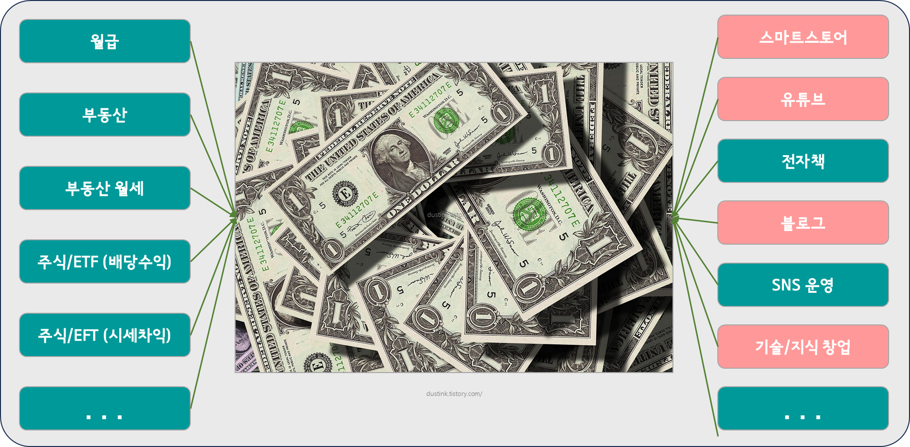위에 기사에도 직장인 10명 중 7명은 N잡러 의향이 있다고 한다. 그만큼 회사 급여 외에 활동으로 부수입을 더 만드려고 하는 사람들이 많다. 아마 그 중 나도 포함이 됐다고 생각하는데, 그 이유가 바로 독서 블로그 겸 스터디 블로그를 하고 있기 때문이다. 새로운 경제 파이브 라인을 만들고 싶다. 과연 그 종류가 얼마나 있을까?