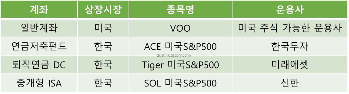 S&P500을 추종하는 S&P500 ETF는 여러 계좌 형태에서 매수가 가능하다. 흔히 우리가 사용하는 해외용 주식계좌가 일반적이고, 세금 혜택을 받을 수 있는 연금저축펀드, 퇴직연금 DC형, 중개형 ISA 계좌가 있다. 이 계좌들에서 이름은 다르지만 동일하게 S&P500 추종하는 S&P500 EFT 이다. 연말정산 세액 혜택까지 받을 수 있으니 이러한 계좌에서 가입하는 것도 좋을 것 같다. (각 상품마다 장/단점이 있으니 개설 및 매수 하기전에 꼭 확인!) 《저축은 답답하지만 투자는 무서운 당신에게》에 소개되어있는 것 처럼 각 계좌마다 운용하는 운용사가 다르다.
