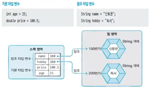 - 참조 타입: 기본 타입을 제외한 배열, 열거, 클래스, 인터페이스 등. 참조 타입의 변수에는 객체의 번지가 저장.
