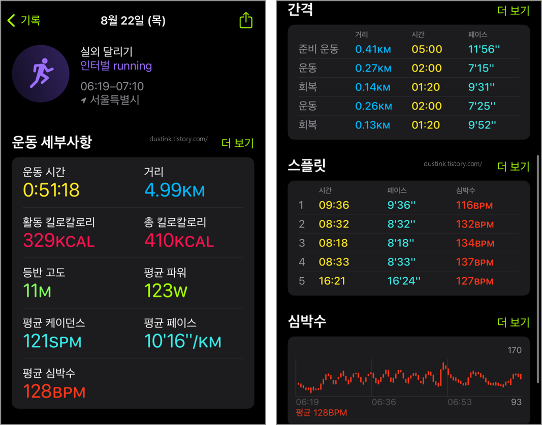 - 마지막 세트에 1분 정도는 아주 빠르게 달려보고 있다. 마지막 세트는 체력이 많이 남아있지 않아 아무리 빨리달려도 느리긴하다.. 마지막 세트를 빠르게 달리면 조금 더 체력이 좋아 진다고 하니 시도해보려고 한다.