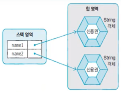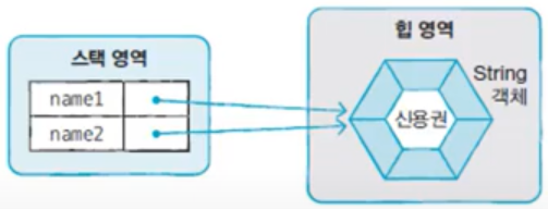 name1과 name2 변수가 동일한 문자열 리터럴인 "신용권"을 참조할 경우 name1과 name2는 같은 String객체를 참조 한다.