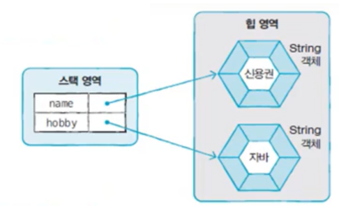 name변수와 hobby변수는 String 객체의 번지 값이 저장 된다.