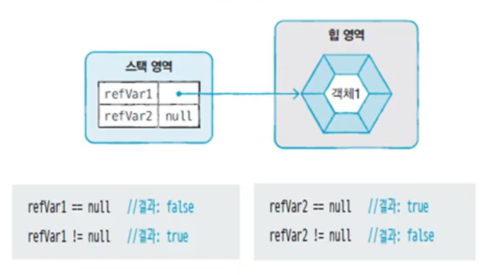 - null: 참조 타입 변수는 객체를 참조하지 않는다는 뜻으로 null 값을 가질 수 있다. null값도 초기값으로 사용 할 수있어 null로 초기화된 참조 변수는 스택 영역에 생성 된다.