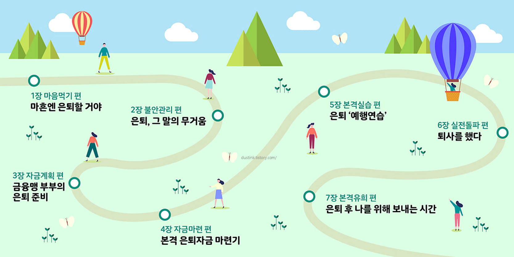은퇴를 하려면 현재보다 얼마의 더 금액이 필요한지(액수는 나오지 않는다.), 얼마를 고정 생활비로 지출을 할 수 있는지 여러 시도끝에 결론을 내면서 은퇴를 한다. 책의 목차처럼 퇴사를 하는 내용은 후반부에 나오기때문에 은퇴를 준비하는 과정을 이야기하지만, 자세한 방법인지는 잘은 모르겠다...