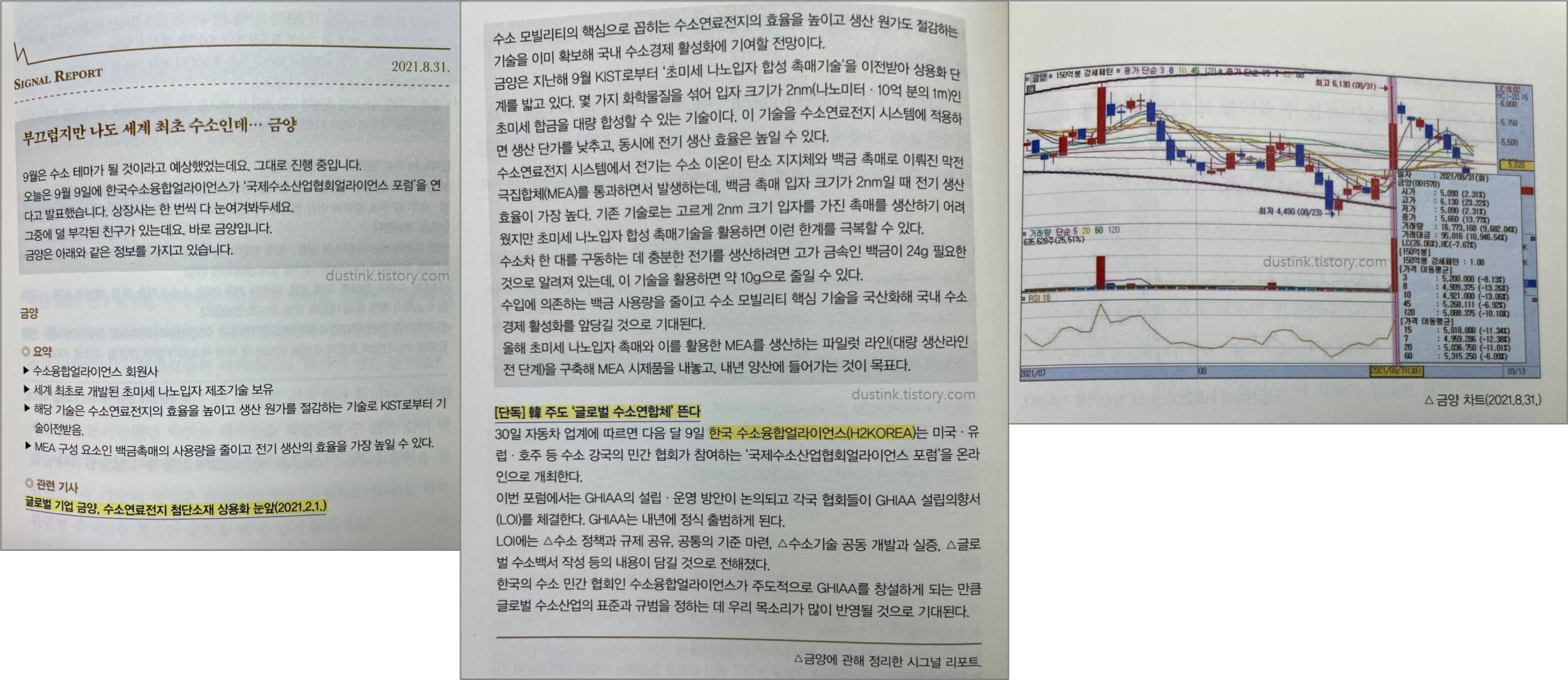 저자는 아래의 내용으로 시그널 리포트를 작성하고 있다. 앞서 말한 것처럼 처음부터 모든 것을 수행하기는 어려우니, 저가가 설명해준 대로 잠들기 전에 상한가와 거래량 천만 주를 기록한 종목을 찾고 그 이유를 찾아 상세하게 정리부터 시작해 보자.