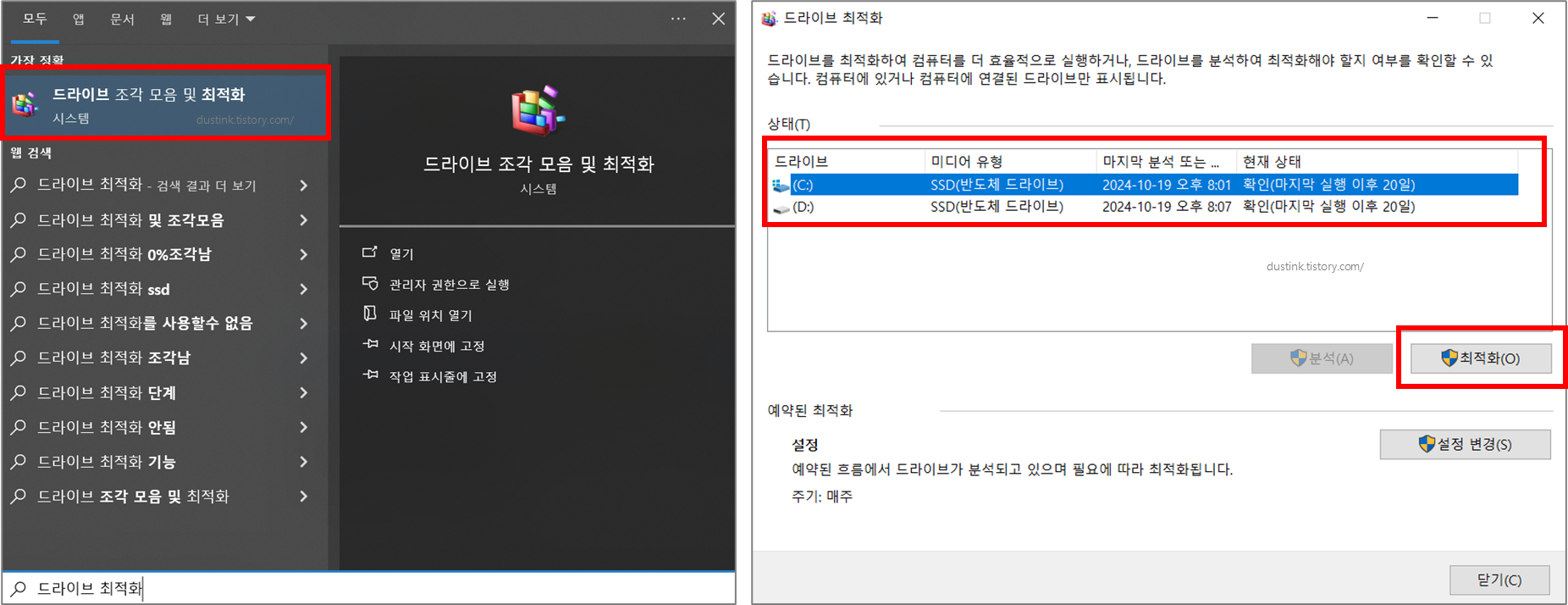 - 어디서? 설정 > 시스템 > 저장소 > 드라이브 조각 모음 및 최적화