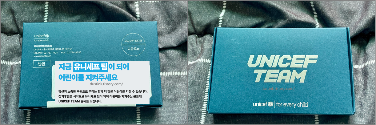 박스에는 UNICEF TEAM 라는 큰 문구로 되어있고, 특히, 상자 아래 부분에 ‘for every child’라는 문구가 새겨져 있어 유니세프의 가치를 다시 한번 되새기게 된다.