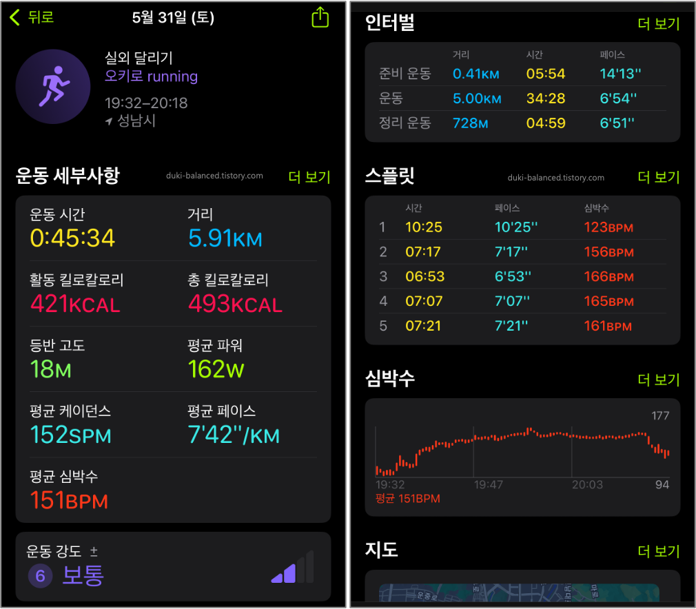 그래서 여전히 천천히 달리면서 내 자세를 찾고, 내 몸이 달리는 것을 적응할 수 있도록 평소에는 8'00"~8'30" 속도로 뛰려고 신경쓴다.