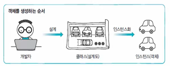 - 객체지향 프로그래밍 단계: 클래스 설계 -> 설계된 클래스로 사용할 객체 생성 -> 객체 이용