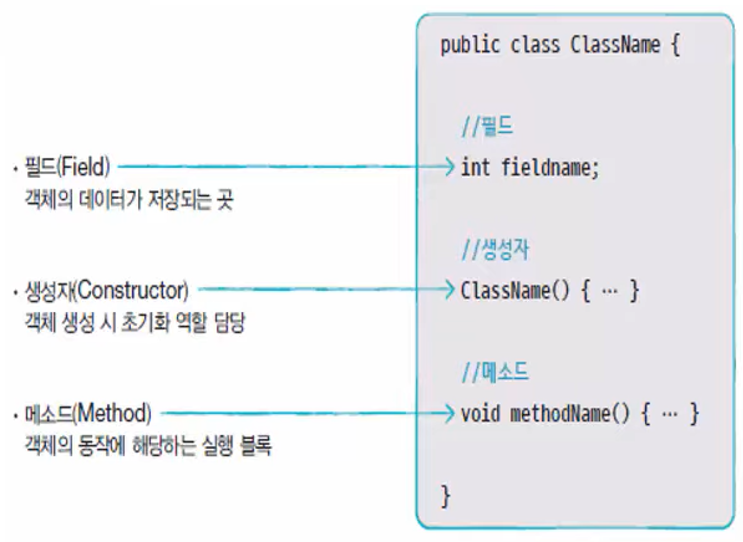 클래스에는 객체가 가져야할 구성 멤버가 선언된다. 구성 멤버에는 필드(Field), 생성자(Constructor), 메소드(Method)가 있다.