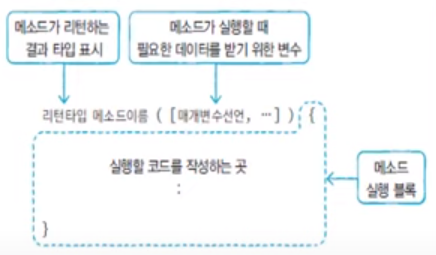 - 매개 변수 선언: 메소드 실행할 때 필요한 데이터를 받기 위한 변수를 선언