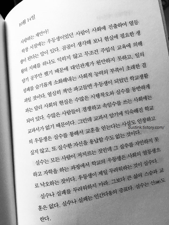 맞는 말이지만 실패를 맛볼때마다 힘들긴 하다. 스스로 성장했다 위안하면서 다시 도전하는 수 밖에.