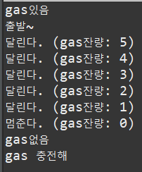 System.out.println("달린다. (gas잔량: " + gas + ")");